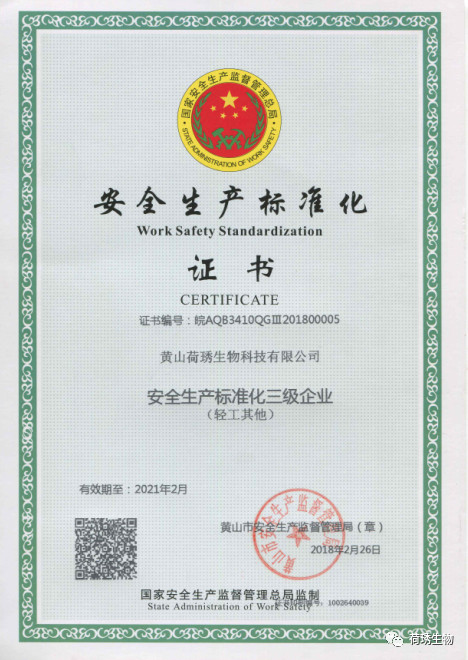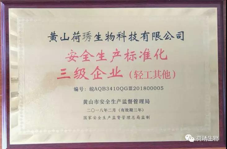 5月31日,黃山市安監環保局在“黃山市2018年度安全生產月活動啟動儀式”上正式授予黃山荷琇公司“安全生產標準化三級企業”榮譽證書及銘牌。