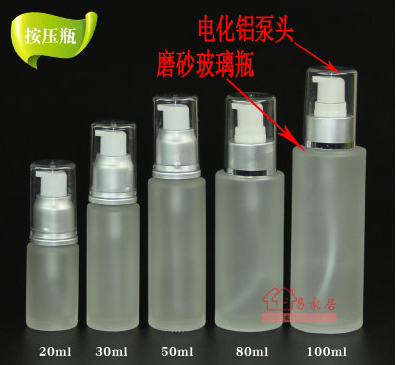 玻璃包裝的組合方式:精化液體類的化妝品則使用窄口玻璃瓶身,玻璃瓶身+塑料泵頭或電化鋁泵頭(容量相對比較高在20到100ml)。見圖一