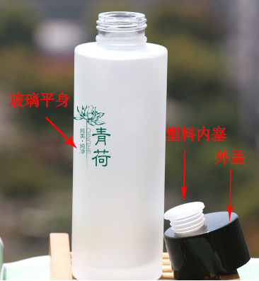 大于100ml以上的爽膚水系列,通常使用玻璃瓶身+小內(nèi)蓋+外蓋,這種包裝,也可以配有泵頭的那種,見圖三