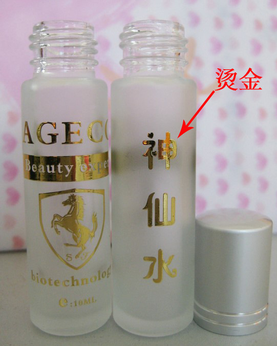絲印:玻璃瓶絲印通常有兩種,一種是高溫油墨絲印,其特點(diǎn)是不易脫色,色澤較沉啞,紫色調(diào)色較難出效果,另一種是低溫油墨絲印,色澤較艷,對油墨的要求較高,否則易脫落,且在瓶子消毒方面要注意。燙金燙銀0.4元/款。